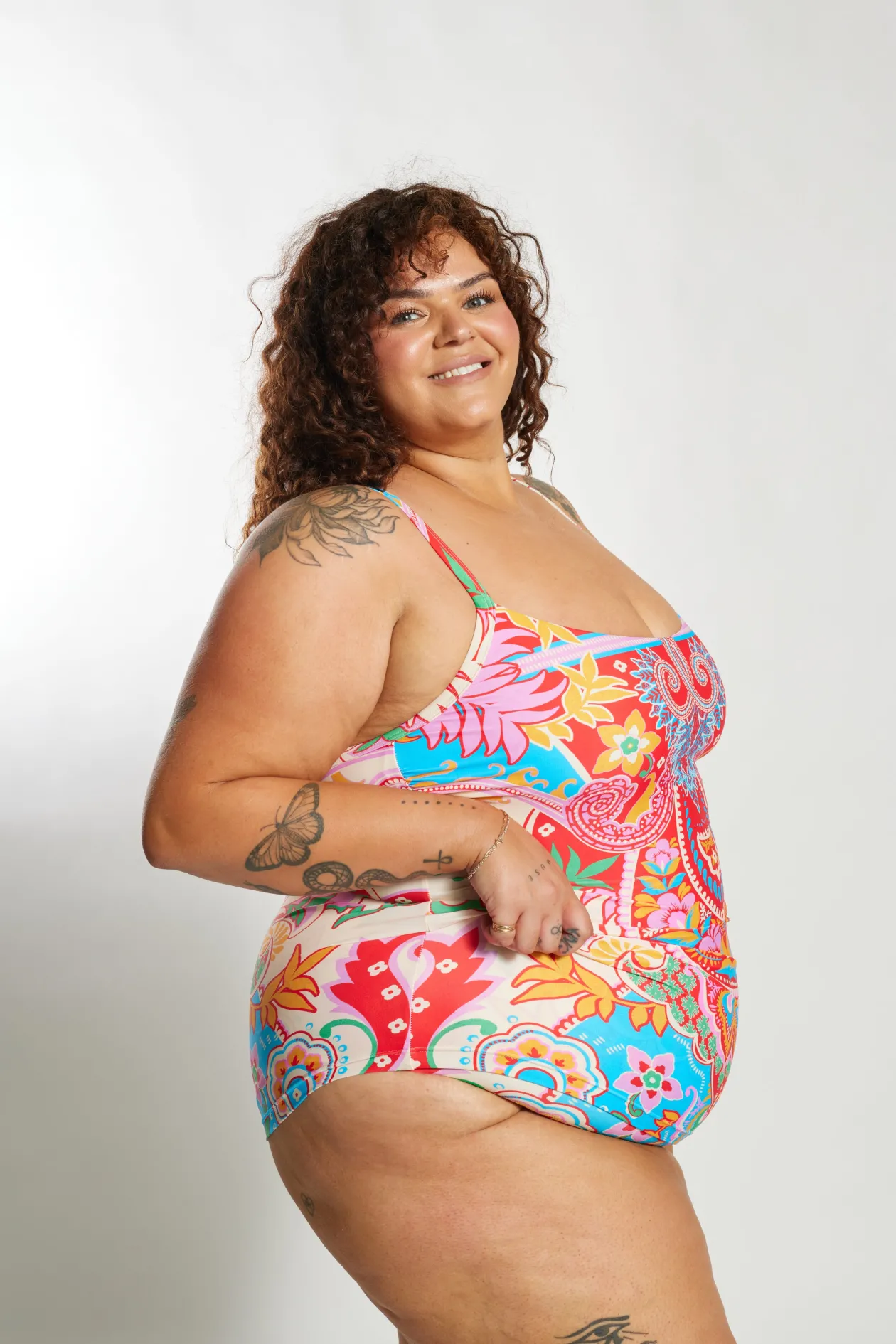 Channel the free-spirited boho vibes of summer with our Infamous Carnival swimwear print, inspired by enchanting oriental blooms and a kaleidoscope of vivid hues. Let it infuse your beach moments with exotic mystique, painting the sands with your own unique palette of confidence and grace.