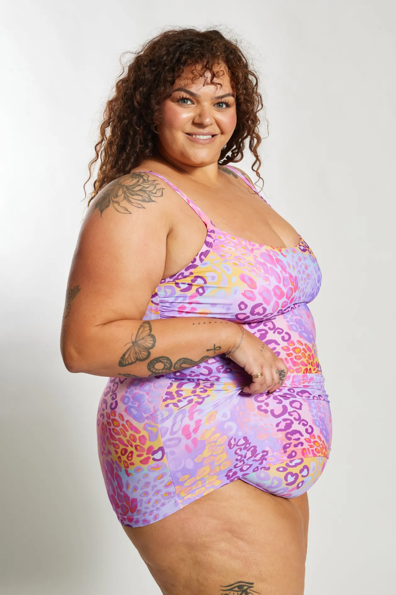 Immerse yourself in pure poolside glam with “Tangerine” swimwear, where fuscia coral purples and tangerine oranges waltz on a lilac backdrop, creating a fancy and gorgeous beach-ready masterpiece!