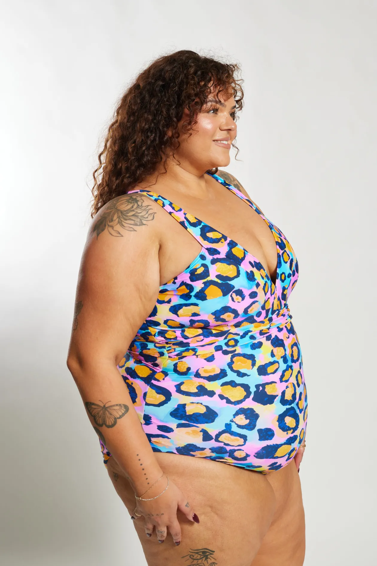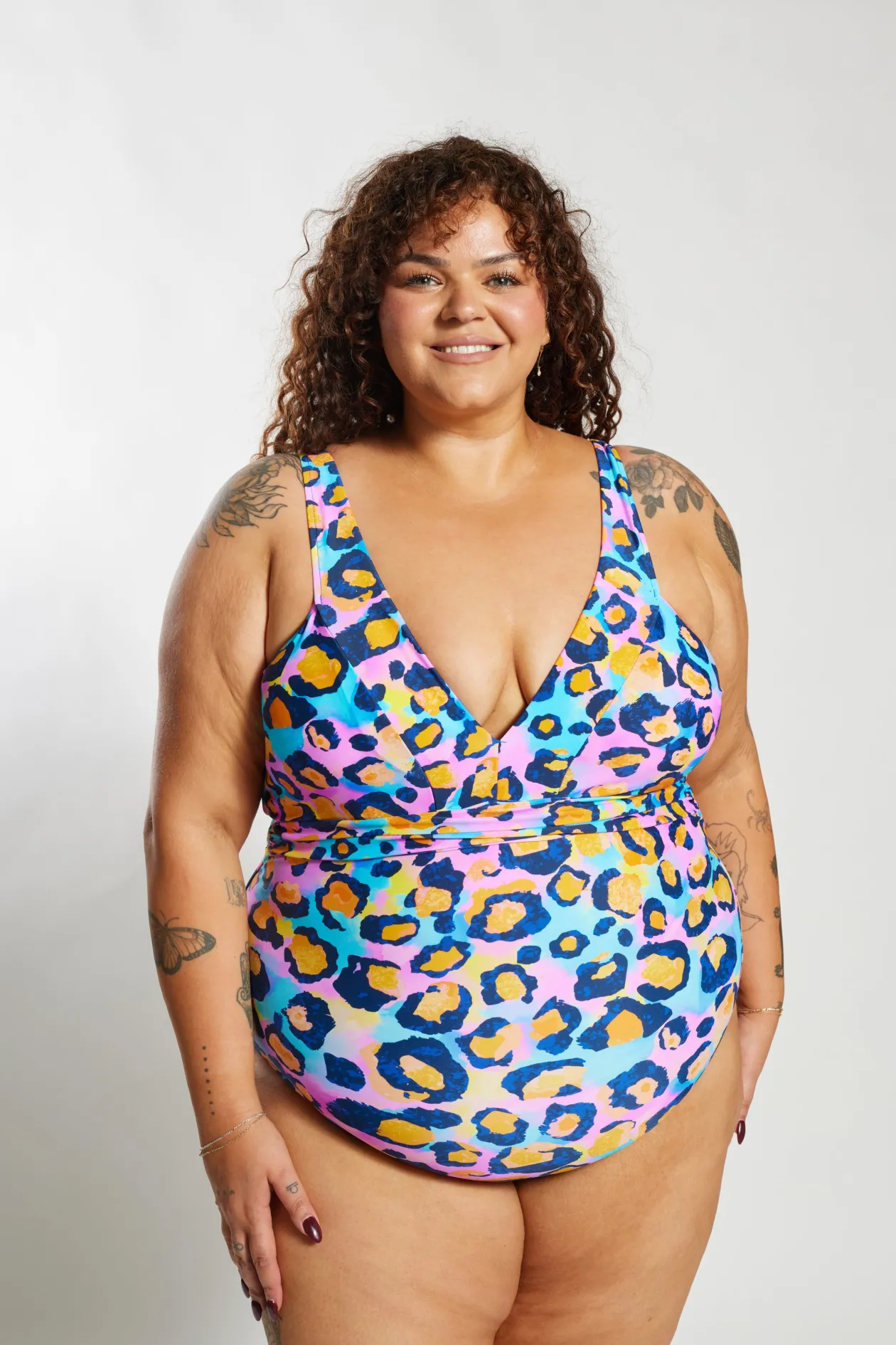 A divine v-neck design, fuller brief bottom, and ruching down the waist, her mission is female form-fitting perfection.