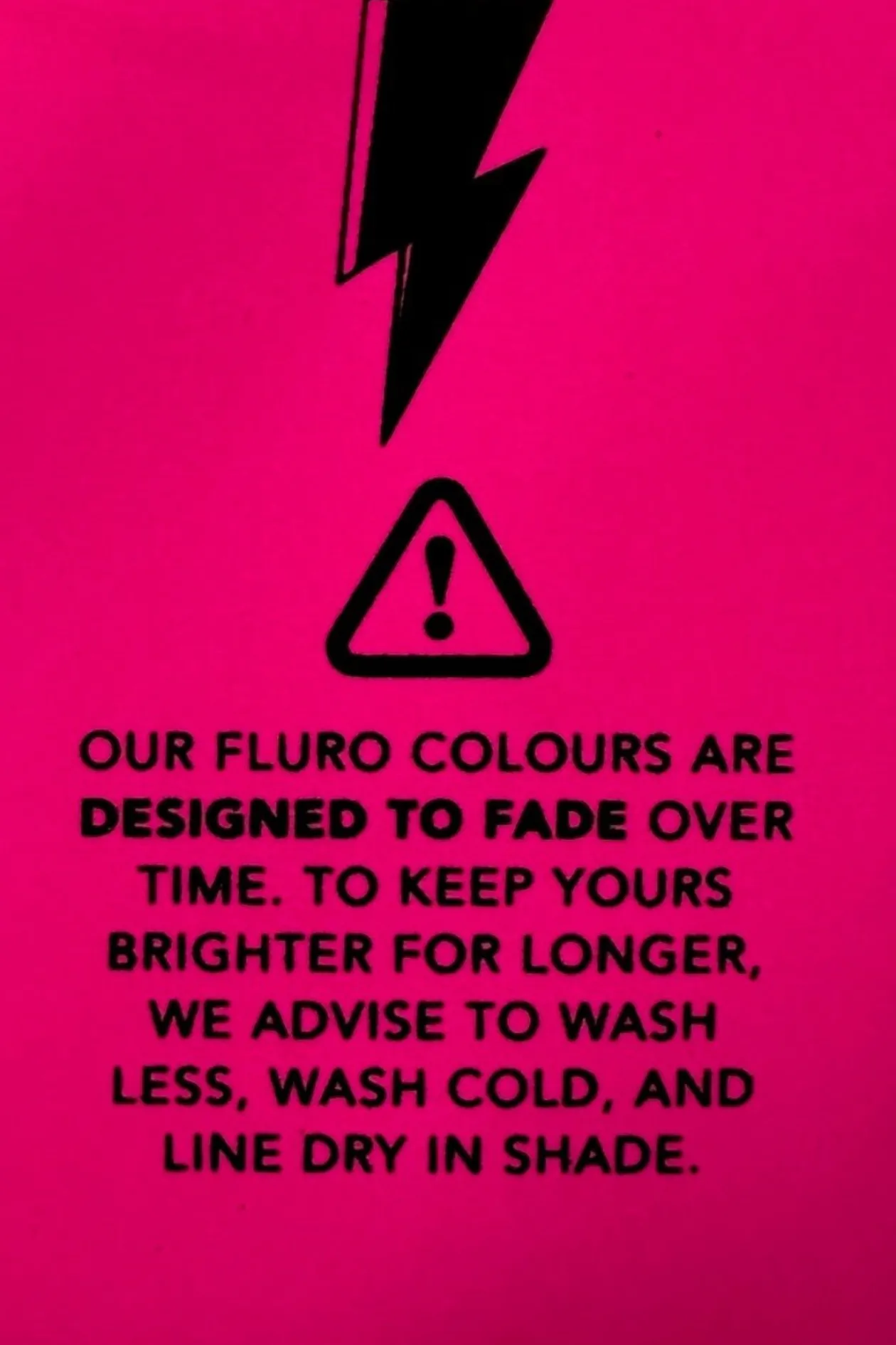 Fluro colours are designed to fade over time. To keep yours brighter for longer, we advise to wash less, wash cold, and line dry in shade.