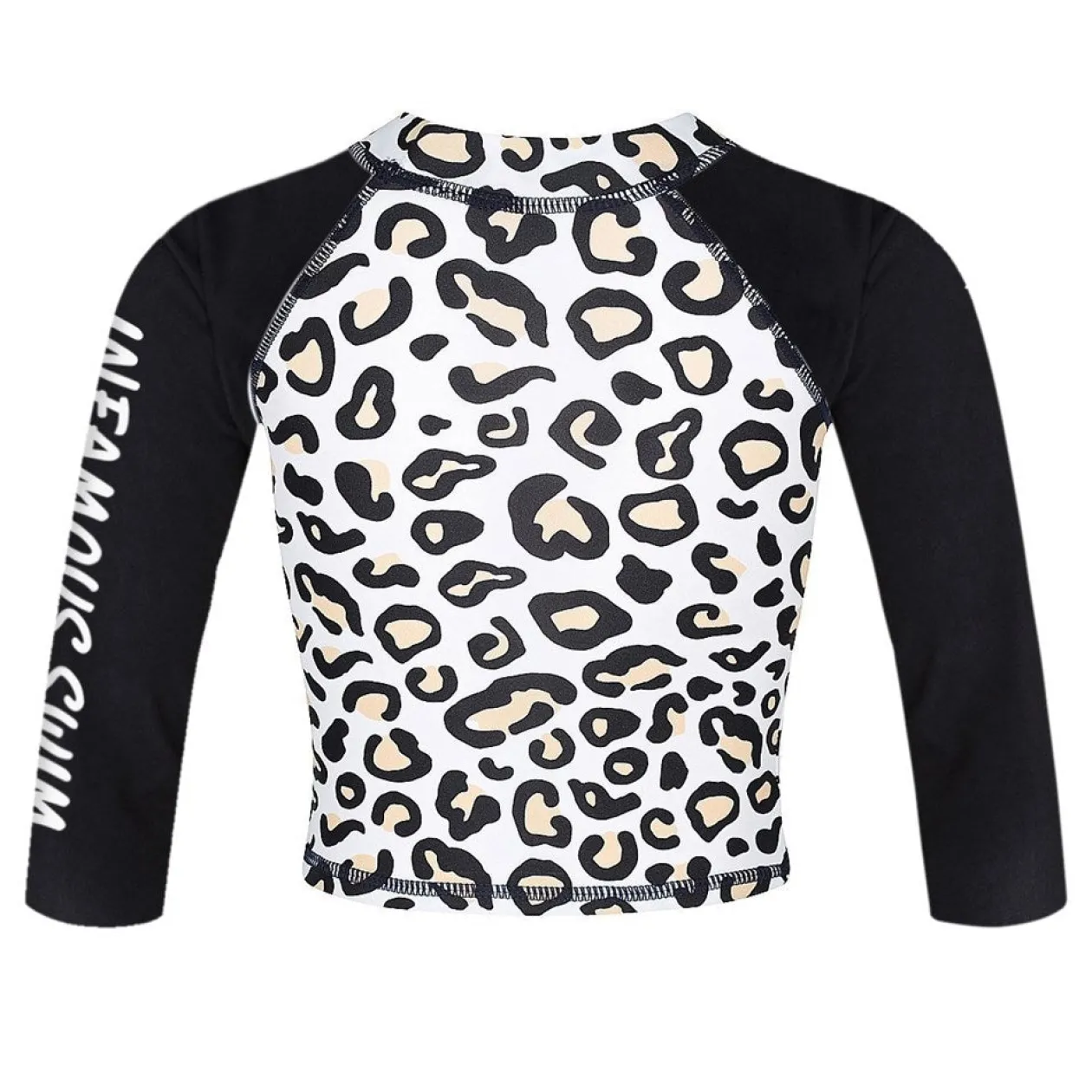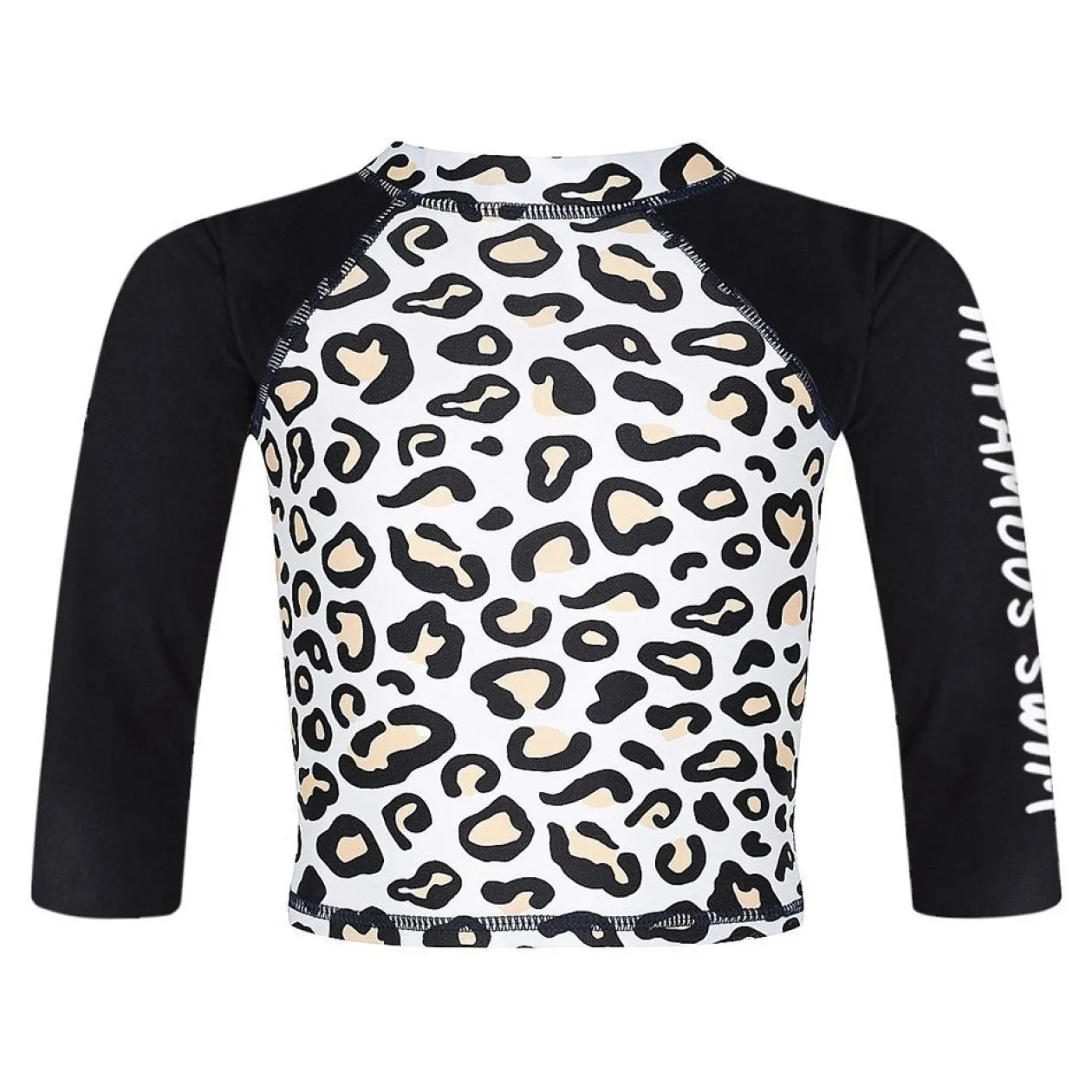 Features Safari Leopard print body with black sleeves and Infamous Swim logo on left arm