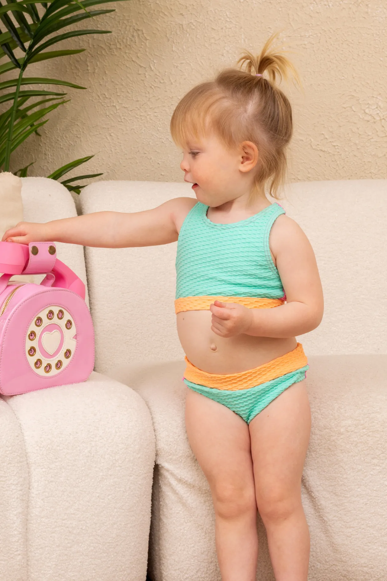 The Mini Gia Set features a scoop neck crop bikini top, with a racer back, and high-rise brief cut bottoms, our little girl’s version of the women’s Ginger bikini bottoms.