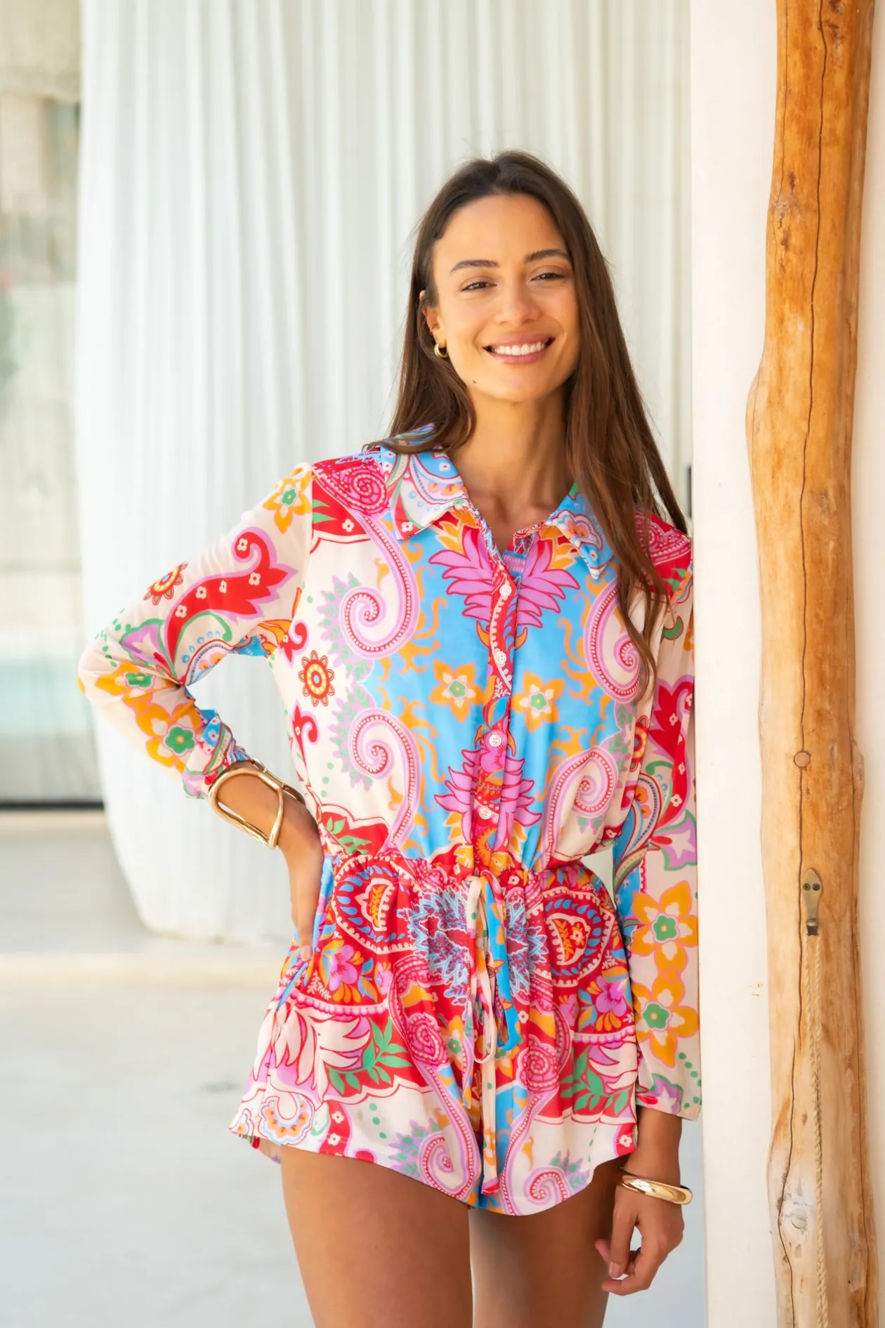 The “Oceana Playsuit” is a relaxed-fit mesh long sleeve outfit with elasticated sleeve cuffs for adjustable wear. It features a lined body and shorts, an elasticated waist with a drawstring for styling, and a button-down front with a collar. Ideal for casual settings, it combines comfort with versatile fashion.